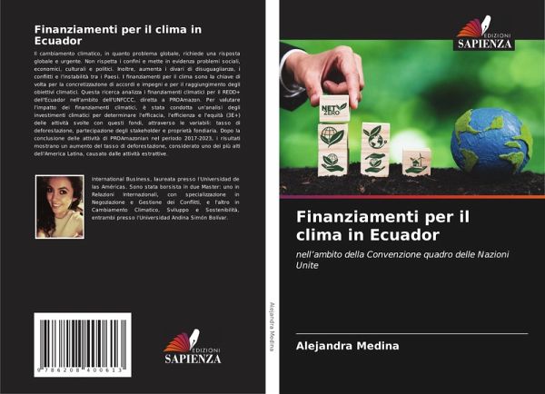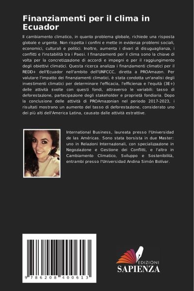 Il cambiamento climatico, in quanto problema globale, richiede una risposta globale e urgente. Non rispetta i confini e mette in evidenza problemi sociali, economici, culturali e politici. Inoltre, aumenta i divari di disuguaglianza, i conflitti e l'instabilità tra i Paesi. I finanziamenti per il clima sono la chiave di volta per la concretizzazione di accordi e impegni e per il raggiungimento degli obiettivi climatici. Questa ricerca analizza i finanziamenti climatici per il REDD+ dell'Ecuador nell'ambito dell'UNFCCC, diretta a PROAmazon. Per valutare l'impatto dei finanziamenti climatici, è stata condotta un'analisi degli investimenti climatici per determinare l'efficacia, l'efficienza e l'equità (3E+) delle attività svolte con questi fondi, attraverso le variabili: tasso di deforestazione, partecipazione degli stakeholder e proprietà fondiaria. Dopo la conclusione delle attività di PROAmazonian nel periodo 2017-2023, i risultati mostrano un aumento del tasso di deforestazione, considerato uno dei più alti dell'America Latina, causato dalle attività estrattive.