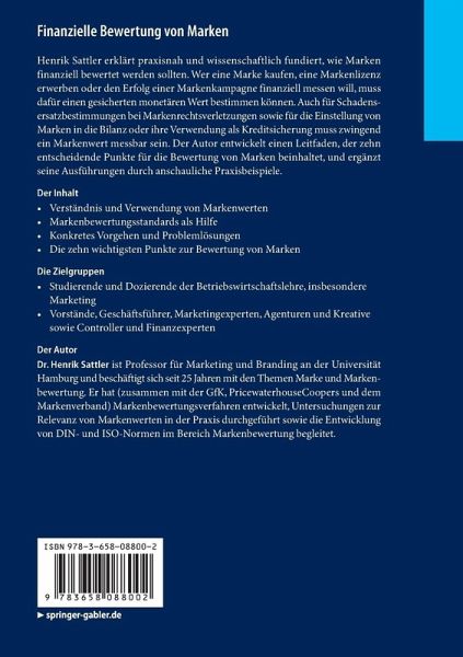 Henrik Sattler erklärt praxisnah und wissenschaftlich fundiert, wie Marken finanziell bewertet werden sollten. Wer eine Marke kaufen, eine Markenlizenz erwerben oder den Erfolg einer Markenkampagne finanziell messen will, muss dafür einen gesicherten monetären Wert bestimmen können. Auch für Schadensersatzbestimmungen bei Markenrechtsverletzungen sowie für die Einstellung von Marken in die Bilanz oder ihre Verwendung als Kreditsicherung muss zwingend ein Markenwert messbar sein. Der Autor entwickelt einen Leitfaden, der zehn entscheidende Punkte für die Bewertung von Marken beinhaltet, und ergänzt seine Ausführungen durch anschauliche Praxisbeispiele.