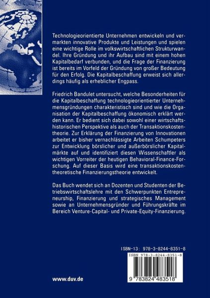 Friedrich Bandulet untersucht, welche Besonderheiten für die Kapitalbeschaffung technologieorientierter Unternehmensgründungen charakteristisch sind und wie die Organisation der Kapitalbeschaffung ökonomisch erklärt werden kann. Er bedient sich dabei sowohl einer wirtschaftshistorischen Perspektive als auch der Transaktionskostentheorie. Zur Erklärung der Finanzierung von Innovationen arbeitet er bisher vernachlässigte Arbeiten Schumpeters zur Entwicklung börslicher und außerbörslicher Kapitalmärkte auf und identifiziert diesen Wissenschaftler als wichtigen Vorreiter der heutigen Behavioral-Finance-Forschung. Auf dieser Basis wird eine transaktionskostentheoretische Finanzierungstheorie entwickelt.