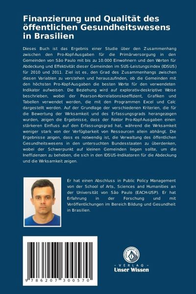 Dieses Buch ist das Ergebnis einer Studie über den Zusammenhang zwischen den Pro-Kopf-Ausgaben für die Primärversorgung in den Gemeinden von São Paulo mit bis zu 10.000 Einwohnern und den Werten für Abdeckung und Effektivität dieser Gemeinden im SUS-Leistungsindex (IDSUS) für 2010 und 2011. Ziel ist es, den Grad des Zusammenhangs zwischen diesen Variablen zu verstehen und herauszufinden, ob die Gemeinden mit den höchsten Pro-Kopf-Ausgaben die besten Werte für den verwendeten Indikator aufweisen. Die Beziehung wird auf explorativ-deskriptive Weise beschrieben, wobei der Pearson-Korrelationskoeffizient, Grafiken und Tabellen verwendet werden, die mit den Programmen Excel und Calc dargestellt werden. Auf der Grundlage der verschiedenen Kriterien, die für die Bewertung der Wirksamkeit und des Erfassungsgrads herangezogen wurden, zeigen die Ergebnisse, dass der Faktor Pro-Kopf-Ausgaben einen stärkeren Einfluss auf den Erfassungsgrad hat, während die Wirksamkeit weniger stark von der Verfügbarkeit von Ressourcen allein abhängt. Die Ergebnisse zeigen, dass es notwendig ist, die Verwaltung des öffentlichen Gesundheitswesens in den untersuchten Bundesstaaten zu überdenken, wobei der Schwerpunkt auf kleinen Gemeinden liegen sollte, um die Ineffizienzen zu beheben, die sich in den IDSUS-Indikatoren für die Abdeckung und die Wirksamkeit zeigen.