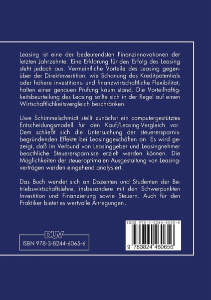 A. Ausgangssituation.- B.Problemstellung.- C.Gang der Untersuchung.- Erstes Kapitel: Grundlagen des Kauf/Leasing-Vergleichs.- A. Das Entscheidungsproblem.- B. Die relevanten Vertragsgestaltungen.- C. Das Entscheidungskriterium.- D.Grundlagen einer Berücksichtigung von Steuerwirkungen.- E. Modellprämissen.- Zweites Kapitel: Die Beurteilung von Mobilien-Leasingverträgen.- A.Vorbemerkungen.- B. Fallstudie 1: Vorteilhaftigkeitsbeurteilung von Mobilien-Leasingverträgen im Grundmodell.- C. Fallstudie 2: Berücksichtigung von unterjährigen Zahlungen und einer Mehrerlösbeteiligung.- D. Fallstudie 3: PKW-Leasing eines Einzelunternehmers.- E. Fallstudie 4: Komplexer Sachverhalt mit Ankauf des Leasinggegenstandes zum Ende der Grundmietzeit.- F. Fallstudie 5: Leasing in den neuen Bundesländern.- Drittes Kapitel: Möglichkeiten und Gründe für Steuerarbitrage bei Leasinggeschäften.- A. Untersuchungsgegenstand.- B. Die Besteuerung des Leasinggebers.- C. Steuerarbitragen bei linearen Leasingratenstrukturen.- D.Möglichkeiten der steueroptimalen Gestaltung von Leasingratenstrukturen.- Thesenförmige Zusammenfassung.- Anlage 1: Symbolverzeichnis.- Anlage 2: Verzeichnis der Steuersätze.- Abkürzungsverzeichnis.- Anhang 1: Nullgewinn des Leasinggebers bei Forfaitierung der Leasingraten.- Anhang 2: Nullgewinn des Leasinggebers bei Einmalzahlung sämtlicher Leasingraten zum Ende der Grundmietzeit.- Rechtsprechungsverzeichnis.- Verwaltungserlasse.