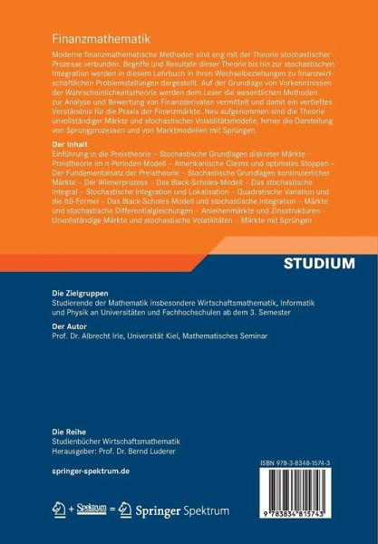 Moderne finanzmathematische Methoden sind eng mit der Theorie stochastischer Prozesse verbunden. Begriffe und Resultate dieser Theorie bis hin zur stochastischen Integration werden in diesem Lehrbuch in ihren Wechselbeziehungen zu finanzwirtschaftlichen Problemstellungen dargestellt. Auf der Grundlage von Vorkenntnissen der Wahrscheinlichkeitstheorie werden dem Leser die wesentlichen Methoden zur Analyse und Bewertung von Finanzderivaten vermittelt und damit ein vertieftes Verständnis für die Praxis der Finanzmärkte. Neu aufgenommen sind die Theorie unvollständiger Märkte und stochastischer Volatilitätsmodelle, ferner die Darstellung von Sprungprozessen und von Marktmodellen mit Sprüngen.
