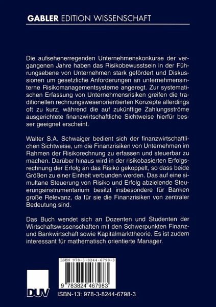 Walter S.A. Schwaiger bedient sich der finanzwirtschaftlichen Sichtweise, um die Finanzrisiken von Unternehmen im Rahmen der Risikorechnung zu erfassen und steuerbar zu machen. Darüber hinaus wird in der risikobasierten Erfolgsrechnung der Erfolg an das Risiko gekoppelt, so dass beide Größen zu einer Einheit verbunden werden. Das auf eine simultane Steuerung von Risiko und Erfolg abzielende Steuerungsinstrumentarium besitzt insbesondere für Banken große Relevanz, da für sie die Finanzrisiken von zentraler Bedeutung sind.
