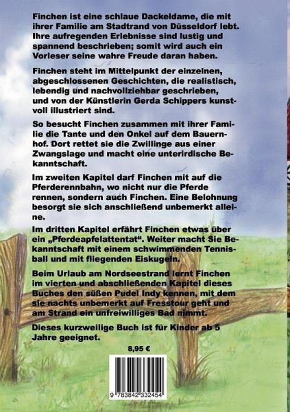 Finchen ist eine schlaue Dackeldame, die mit ihrer Familie am Stadtrand von Düsseldorf lebt. Ihre aufregenden Erlebnisse sind lustig und spannend beschrieben; somit wird auch ein Vorleser seine wahre Freude daran haben. Finchen steht im Mittelpunkt der einzelnen, abgeschlossenen Geschichten, die realistisch, lebendig und nachvollziehbar geschrieben und von der Künstlerin Gerda Schippers kunstvoll illustriert sind. So besucht Finchen zusammen mit ihrer Familie die Tante und den Onkel auf dem Bauernhof. Dort rettet sie die Zwillinge aus einer Zwangslage und macht eine unterirdische Bekanntschaft. Im zweiten Kapitel darf Finchen mit auf die Pferderennbahn, wo nicht nur die Pferde rennen, sondern auch Finchen. Eine Belohnung besorgt sie sich anschließend unbemerkt alleine. Im dritten Kapitel erfährt Finchen etwas über ein "Pferdeapfelattentat". Weiter macht Sie Bekanntschaft mit einem schwimmenden Tennisball und mit fliegenden Eiskugeln.Beim Urlaub am Nordseestrand lernt Finchen im vierten und abschließenden Kapitel dieses Buches den süßen Pudel Indy kennen, mit dem sie nachts unbemerkt auf Fresstour geht und am Strand ein unfreiwilliges Bad nimmt. Dieses kurzweilige Buch ist für Kinder ab 5 Jahre geeignet.