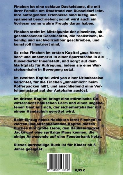 Finchen ist eine schlaue Dackeldame, die mit ihrer Familie am Stadtrand von Düsseldorf lebt. Ihre aufregenden Erlebnisse sind lustig und spannend beschrieben; somit wird auch ein Vorleser seine wahre Freude daran haben. Finchen steht im Mittelpunkt der einzelnen, abgeschlossenen Geschichten, die realistisch, lebendig und nachvollziehbar geschrieben und kunstvoll illustriert sind. So reist Finchen im ersten Kapitel "aus Versehen" und unbemerkt in einer Sporttasche in die Düsseldorfer Innenstadt, und sorgt auf dem Marktplatz für Aufregung, indem sie eine Wursteisenbahn in Bewegung setzt.Im zweiten Kapitel wird von einer Urlaubsreise berichtet, für die Finchen "unheimlich" beim Kofferpacken hilft, und anschließend eine Verfolgungsjagd auf der Autobahn auslöst.Im dritten Kapitel bringt eine stürmische Gewitternacht höllischen Lärm und einen ungebetenen Gast mit sich, der sicherheitshalber mit einem Handschuh gerettet wird.Beim Einzug neuer Nachbarn lernt Finchen im vierten und abschließenden Kapitel dieses Buches ihre große Liebe, den Rauhaardackel Jacky und eine spritzige Maus kennen, die einige Anwesende auf eine Fensterbank hetzt.Dieses kurzweilige Buch ist für Kinder ab 5 Jahre geeignet.