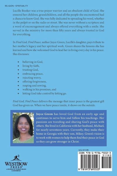 Lucille Booker was a true prayer warrior and an obedient child of God. She ensured her children, grandchildren, and all the people she encountered had a chance to know God. She was fully dedicated to spreading his word, whether in the pulpit or on the radio or street. She was never without a scripture and a word of encouragement and always offered everything with a smile. She served in the ministry for more than fifty years and always trusted in God for everything. In Find God, Find Peace, author Joyce Green, Lucille's daughter, pays tribute to her mother's legacy and her spiritual work. Green shares the lessons she has learned and how she welcomed God to lead her in living every day in his peace. She discusses: ¿ believing in God, ¿ living by faith, ¿ trusting God, ¿ embracing peace, ¿ rejecting worry, ¿ offering forgiveness, ¿ reaping and sowing, ¿ walking in his promises, and ¿ letting God take control by letting go. Find God, Find Peace delivers the message that inner peace is the greatest gift God has given us. When we have peace inside, it shows on the outside.