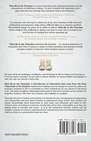 We have all faced challenges, roadblocks, and situations in life we believe are burying us. It is from these "trenches" we are able to choose whether to remain hidden and implode or claw our way out toward a better day. Find Me in the Trenches: A Recollection of Adversities That Lead Even the Most Vulnerable to Be Resilient explores how holding onto the things we cannot fix allows the mundane moments in life to overwhelm us. Once understood, we can choose to rise above it all. The father-daughter relationship showcased in this book reminds us our parents are imperfect humans with their own traumas and tragedies to navigate. Through the eyes of Arthur and Annette, we witness the dire consequences of suppressing one's insecurities and how much freedom is experienced when Arthur and Annette can openly acknowledge those insecurities to each other, and ultimately give them to God. Arthur's story of resilience in the face of adversity shows that vulnerability is, in fact, the highest form of strength and power. It is in the connection between Arthur and his daughter Annette we come to understand how transparency and trust between parent and child can foster an unbreakable bond over time.