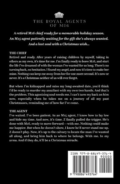 A retired M16 chief ready for a memorable holiday season. An M15 agent patiently waiting for the gift she's always wanted. And a lost soul with a Christmas wish... The Chief Retired and ready. After years of raising children by myself, taking in others as my own, it's time for me. I'm finally ready to leave M16, and start the life I've dreamed of with the woman I've wanted for so long. There's no turning back, no hesitation. I found my angel, and now it's time to make her mine. Nothing can keep me away from her for one more second. It's now or never. It's a Christmas neither of us will ever forget. But when I'm kidnapped and miss my long-awaited date, you'd think I'd be ready to murder my assailant with my own two hands. And that's the problem. This agonizing soul needs me. I can't turn my back on him now, especially when he takes me on a journey of all my past Christmases, reminding me of how far I've come. The Agent I've waited. I've been patient. As an M15 agent, I know how to lay low and bide my time. And now, it's time. Z finally pulled the trigger. He's done with M16, ready to move forward-with me. Nothing could make me happier. But when he doesn't show, I know he'd never stand me up. Z doesn't play. Now, it's up to the calvary to locate the man I've wanted all along, and bring him back to where he belongs. With me. In my arms. And if they do, it'll be a Christmas miracle.