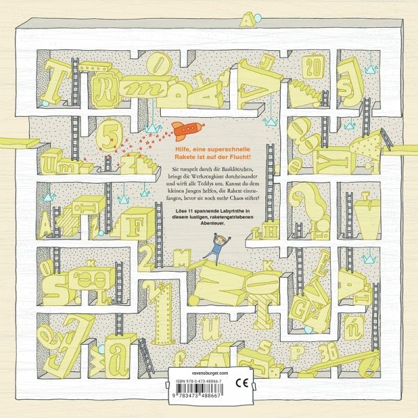 In diesem Rätselbuch können hier Abenteuerlustige den rasanten Flug der Rakete durch das Kinderzimmer verfolgen und lustige Such-Abenteuer in 11 Labyrinth-Rätseln erleben. Dabei führt der Weg der Rakete durch Papierkraniche, Rennbahnen, Weltraum-Mobiles und noch mehr erstaunliche Miniaturwelten.