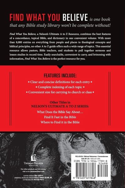 Find What You Believe is the newest addition to Nelson's A to Z Guides. This book combines the best features of a concordance, topical Bible, and dictionary.Entries on everything from people and places to theological concepts and biblical principles appear in one convenient volume. With more than 8,000 entries, no other A to Z guide offers such a wide range of topics. This volume is essential for pastors, Bible teachers, and students. Features include: Clear and concise definitions for each entry Complete indexing of each topic Convenient size for carrying to church or class