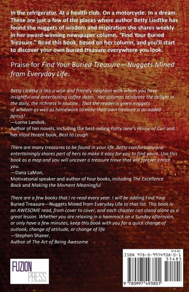 In the refrigerator. At a health club. On a motorcycle. In a dream. These are just a few of the places where author Betty Liedtke found the nuggets of wisdom and inspiration she shared for 15 years in her award-winning weekly newspaper column, "Find Your Buried Treasure." Read this book, based on her columns, and you’ll start to discover your own buried treasure everywhere you look. Each of the 30 stories in the book details insights and observations gleaned from everyday events and experiences, including trips to the grocery store or laundromat, falling down and getting up again, breaking old habits and developing new ones, or stopping to notice the beauty in nature and in silence. In addition to the nuggets of wisdom discovered and shared by the author, each story includes a related and easy-to-follow suggestion that will help you find the "nuggets" in your own life. Told with humor, thoughtfulness, and a light touch, this book is a quick, easy read, whether you go through it all in one sitting, or read the stories one day at a time, giving yourself the opportunity to fully absorb the wisdom in each one and to determine how closely it relates to circumstances in your own life. Find Your Buried Treasure—Nuggets Mined from Everyday Life makes an excellent morning devotional or evening reflection. It will help you start your day with encouragement and enthusiasm, or end your day feeling cherished and enriched.