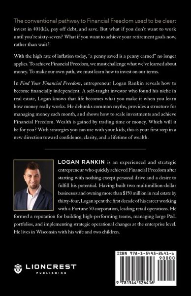 The conventional pathway to Financial Freedom used to be clear: invest in 401(k)s, pay off debt, and save. But what if you don't want to work until you're sixty-seven? What if you want to achieve your retirement goals now, rather than wait? With the high rate of inflation today, "a penny saved is a penny earned," no longer applies. To achieve Financial Freedom, we must challenge what we've learned about money. To make our own path, we must learn how to invest on our terms. In Find Your Financial Freedom, entrepreneur Logan Rankin reveals how to become financially independent. A self-taught investor who found his niche in real estate, Logan knows that life becomes what you make it when you learn how money really works. He debunks common myths, provides a structure for managing money each month, and shows how to scale investments and achieve Financial Freedom. Wealth is gained by trading time or money. Which will it be for you? With strategies you can use with your kids, this is your first step in a new direction toward confidence, clarity, and a lifetime of wealth.