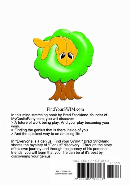 In this mind stretching book by Brad Strickland, founder of MyCaslteParty.com, you will discover: > A future of work being play. And your play becoming your work. > Finding the genius that is there inside of you. > And the quickest way to an amazing life. In "Everyone is a genius. Find your SWIM!" Brad Strickland shares the mystery of "Genius" discovery. Through the story of his own journey and through the journey of his personal friends you will learn that your life can be at it's best by discovering your genius.