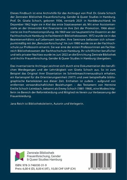 Prof. Dr. Gisela Schoch, geboren am 12. Januar 1936, verstarb 2021 in Norddeutschland. Im Dezember 1962 legte sie in Kiel das erste Staatsexamen ab. Mit einer Assistentenstelle an der Universität Kiel finanzierte sie ihre Zeit der Promotion. 1966 absolvierte sie ihre Promotionsprüfung. Ab 1969 war sie hauptamtliche Dozentin an der Fachhochschule Hamburg im Fachbereich Bibliothekswesen. 1972 wurde sie in das Beamtenverhältnis auf Lebenszeit berufen. Ihre Seminare befassten sich schwerpunktmäßig mit der "Benutzerforschung". Im Juni 1980 wurde sie an der Fachhochschule zur Professorin ernannt. Sie war damit eine der ersten Professorinnen am Fachbereich Bibliothekswesen der Fachhochschule Hamburg. Ihr schriftlicher beruflicher und teils privater Nachlass wurde im Juni 2022 an die Einrichtung Zentrale Bibliothek und Archiv Frauenforschung, Gender & Queer Studies in Hamburg übergeben. Das inventarisierte Archivgut zeichnet sich durch eine Dokumentation des beruflichen Werdeganges und der Lehrtätigkeit von Gisela Schoch aus. So ist zum Beispiel das Original ihrer Dissertation im Schreibmaschinenausdruck erhalten, ein Kartenspiel für die Orientierungseinheit (1977) und zwei beispielhafte bibliographische Karteikästen aus dieser Zeit. Enthalten ist zudem - aufgrund von entfernten verwandtschaftlichen Beziehungen - das Testament von Hermine Emilie Schoch-Leimbach, bekannt als Emmy Schoch (1881-1968), eine Modeschöpferin im Bereich der Reformkleidung und Mitglied im Verein zur Verbesserung der Frauenkleidung.