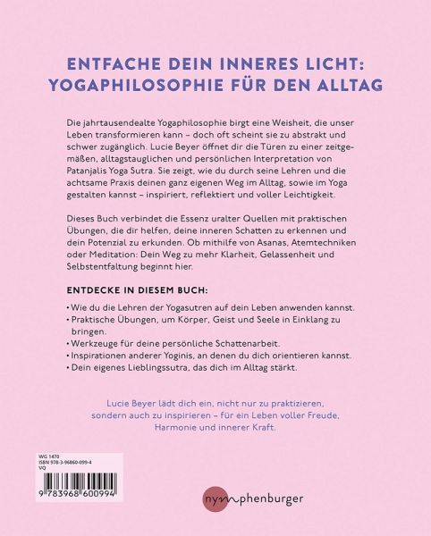 Die alte Yoga-Philosophie ist voller Weisheit - doch für viele zu "fern" und zu schwer. Um die Essenz daraus in moderner Weise zu interpretieren, zeigt Lucie Beyer (@lucie.beyer), wie man auf der Grundlage von Patanjali's achtgliedrigem Yogapfad achtsam seinen eigenen Yogaweg aufbaut - modern, jung, alltagstauglich. Der Weg beginnt damit - unterstützt von Bewusstwerdungen und Übungen -, den eigenen Schatten zu kennen, diesen alchemistisch zu einer eigenen "Medizin" zu verwandeln, um anschließend damit das innere Licht anzuzünden.