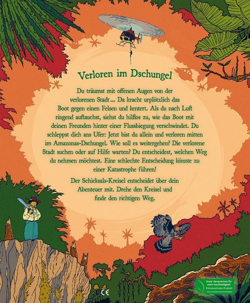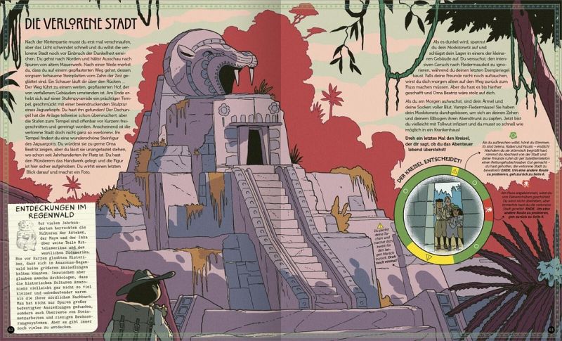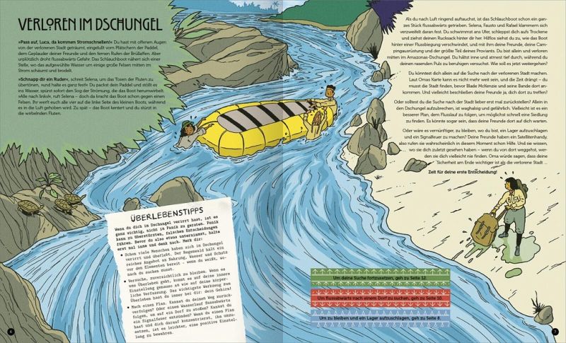 Mit offenen Augen träumst du von der Verlorenen Stadt, eingelullt von dem Geplauder deiner Freunde und den fernen Rufen der Brüllaffen. Da kracht das Boot gegen einen Felsen und kentert. Als du nach Luft ringend auftauchst, siehst du, wie das Boot mit deinen Freunden hinter einer Flussbiegung verschwindet. Am Ufer schleppst du dich aufs Trockene. Jetzt bist du allein und verloren mitten im Amazonas-Dschungel. Wie soll es jetzt weitergehen?