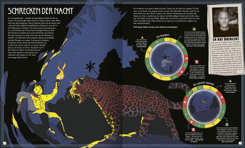 Die Abenteuergeschichte wird von Überlebenstipps und realen Berichten von Menschen begleitet, die in der Wildnis trotz aller Widrigkeiten überlebt haben. Erfahre, wie man ein Floß aus Balsaholz baut oder welche Früchte essbar sind.