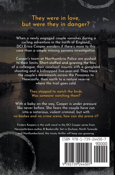 When a newly engaged couple vanishes during a cycling adventure in the north of England, DCI Erica Cooper wonders if there's more to this case than a simple missing persons investigation. Cooper's team at Northumbria Police are pushed to their limits. Short-staffed and grieving the loss of a colleague, their caseload mounts with a gangland shooting and a kidnapped five-year-old. They trace the couple's movements across the Pennines to Newcastle, then north to a nature reserve where the trail goes cold. They stopped to watch the birds. But was someone watching them? With a baby on the way, Cooper is under pressure like never before. She fears the couple have run into a notorious, violent criminal, but with no bodies and no crime scene, how can she prove it? Finders Keepers is the sixth novel in the DCI Cooper series from Newcastle-born author B Baskerville. Set in Durham, North Tyneside and Northumberland, this twisty thriller will keep you guessing. Great for fans of LJ Ross, AM Peacock and Howard Linskey.