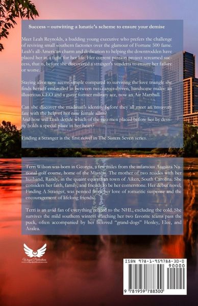 Success - outwitting a lunatic's scheme to ensure your demise Meet Leah Reynolds, a budding young executive who prefers the challenge of reviving small southern factories over the glamour of Fortune 500 fame. Leah's all-American charm and dedication to helping the downtrodden have placed her in a fight for her life. Her current passion project screamed success, that is, before she discovered a stranger's vendetta to ensure her failure or worse. Staying alive now seems simple compared to surviving the love triangle she finds herself embroiled in between two career-driven, handsome males: an illustrious CEO and a gutsy former military ace, now an Air Marshall. Can she discover the madman's identity before they all meet an unsavory fate with the help of her new female allies? And how will Leah decide which of the two men placed before her by destiny holds a special place in her heart? Finding a Stranger is the first novel in The Sisters Seven series.