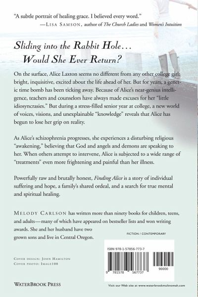 Sliding into the Rabbit Hole... Would She Ever Return? On the surface, Alice Laxton seems no different from any other college girl: bright, inquisitive, excited about the life ahead of her. But for years, a genetic time bomb has been ticking away. Because of Alice's near-genius intelligence, teachers and counselors have always made excuses for her "little idiosyncrasies.” But during a stress-filled senior year at college, a new world of voices, visions, and unexplainable "knowledge” causes Alice to begin to lose her grip on reality. As Alice's schizophrenia progresses, she experiences a disturbing religious "awakening,” believing that God and angels and demons are speaking to her. When others attempt to intervene, Alice is subjected to a wide range of "treatments” even more frightening and painful than her illness. Powerfully raw and brutally honest, Finding Alice is a story of individual suffering and hope, a family's shared ordeal, and a search for true mental and spiritual healing.