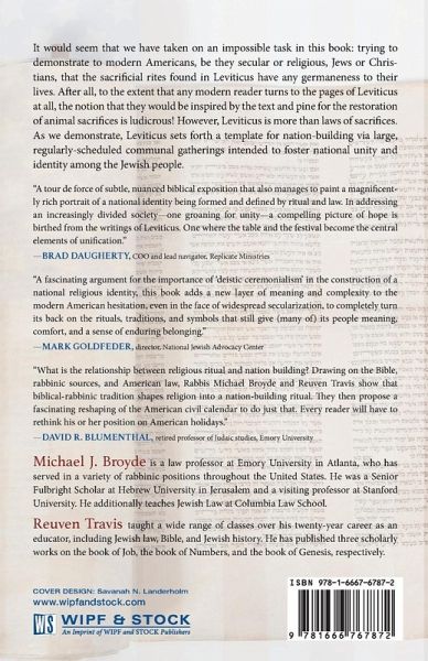 It would seem that we have taken on an impossible task in this book: trying to demonstrate to modern Americans, be they secular or religious, Jews or Christians, that the sacrificial rites found in Leviticus have any germaneness to their lives. After all, to the extent that any modern reader turns to the pages of Leviticus at all, the notion that they would be inspired by the text and pine for the restoration of animal sacrifices is ludicrous! However, Leviticus is more than laws of sacrifices. As we demonstrate, Leviticus sets forth a template for nation-building via large, regularly-scheduled communal gatherings intended to foster national unity and identity among the Jewish people.