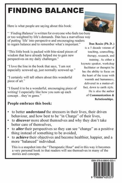 Here is what people are saying about this book: " 'Finding Balance' is written for everyone who feels too busy or too weighted by life's demands. Dan has a marvellous way of putting 'life' into perspective and encouraging readers to regain balance and to remember what's important." "This little book is packed with bite-sized pieces of wisdom that have already helped me to gain new perspectives on my daily challenges." "I love the line in the book that says, 'I am not especially screwed up, just normally screwed up." "I certainly will tell others about this wonderful piece of art." "I found it to be a wonderful, encouraging piece of writing! I especially like how you sum up each concept...they're gems." People embrace this book: ¿ to better understand the stressors in their lives, their driven behaviour, and how best to be "in Charge" of their lives, ¿ to discover more about themselves and why they don't take better care of themselves, ¿ to alter their perspectives so they can see "change" as a positive thing instead of something to be avoided, ¿ to achieve their objectives and become healthier, happier, and a more "balanced" individual. This is a snapshot into the "Therapeutic Hour" and in this way it becomes a very personal book in that readers will see themselves in many of the stories and concepts.
