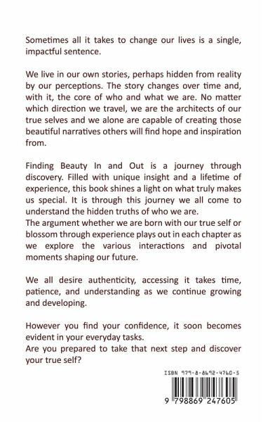 Sometimes all it takes to change our lives is a single, impactful sentence. We live in our own stories, perhaps hidden from reality by our perceptions. The story changes over time and, with it, the core of who and what we are. No matter which direction we travel, we are the architects of our true selves and we alone are capable of creating those beautiful narratives others will find hope and inspiration from. Finding Beauty In and Out is a journey through discovery. Filled with unique insight and a lifetime of experience, this book shines a light on what truly makes us special. It is through this journey we all come to understand the hidden truths of who we are. The argument whether we are born with our true self or blossom through experience plays out in each chapter as we explore the various interactions and pivotal moments shaping our future. We all desire authenticity, accessing it takes time, patience, and understanding as we continue growing and developing. However you find your confidence, it soon becomes evident in your everyday tasks. Are you prepared to take that next step and discover your true self?