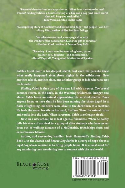 Caleb's finest hour is his deepest secret. Not even his parents knew what really happened after three nights in the wilderness. Now another school, another class, and another group of kids who were not his friends. Finding Caleb is the story of the new kid with a secret. The brutal summer storm, in the dark, in the Wyoming wilderness, hungry and alone, Caleb hears an animal approaching his survival shelter. Does anyone know or care that he has been missing for three days? In a flash of lightning, his fears come alive in the dark form of a creature. He feels the warm breath on his hand, his face. Then the animal turns and vaults into the dark. When it returns, Caleb is no longer afraid. Now, in a new school, he is lost again... friendless. When he boldly tells his story of survival to a group of elite students who have never been out of walking distance of a McDonalds, friendships form and even romance blooms. Author, and rescue-dog handler, Scott Hammond's Finding Caleb, Book 1 in the Search and Rescue Dog Series is a story of hope about a loyal dog whose mission is to bring people home. It is a must-read for any wandering teen wondering how to connect with the real world.