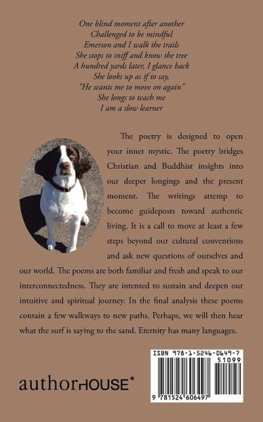 The poetry is designed to open your inner mystic. The poetry bridges Christian and Buddhist insights into our deeper longings and the present moment. The writings attempt to become guideposts toward authentic living. It is a call to move at least a few steps beyond our cultural conventions and ask new questions of ourselves and our world. The poems are both familiar and fresh and speak to our interconnectedness. They are intended to sustain and deepen our intuitive and spiritual journey. In the final analysis these poems contain a few walkways to new paths. Perhaps we will then hear what the surf is saying to the sand. Eternity has many languages.