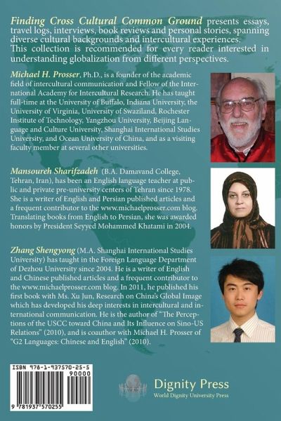 Finding Cross Cultural Common Ground presents essays, travel logs, interviews, book reviews and personal stories, spanning diverse cultural backgrounds and intercultural experiences. This collection is recommended for every reader interested in understanding globalization from different perspectives. Michael H. Prosser, Ph.D., is a founder of the academic field of intercultural communication and Fellow of the International Academy for Intercultural Research. He has taught full-time at the University of Buffalo, Indiana University, the University of Virginia, University of Swaziland, Rochester Institute of Technology, Yangzhou University, Beijing Language and Culture University, Shanghai International Studies University, and Ocean University of China, and as a visiting faculty member at several other universities. Mansoureh Sharifzadeh (B.A. Damavand College, Tehran, Iran), has been an English language teacher at public and private pre-university centers of Tehran since 1978. She is a writer of English and Persian published articles and a frequent contributor to the www.michaelprosser.com blog. Translating books from English to Persian, she was awarded honors by President Seyyed Mohammed Khatami in 2004. Zhang Shengyong (M.A. Shanghai International Studies University) has taught in the Foreign Language Department of Dezhou University since 2004. He is a writer of English and Chinese published articles and a frequent contributor to the www.michaelprosser.com blog. In 2011, he published his first book with Ms. Xu Jun, Research on China's Global Image which has developed his deep interests in intercultural and international communication. He is the author of "The Perceptions of the USCC toward China and Its Influence on Sino-US Relations" (2010), and is coauthor with Michael H. Prosser of "G2 Languages: Chinese and English" (2010).