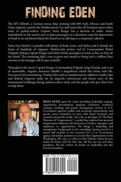 The MV Militobi, a German rescue ship, teeming with 600 Arab, African, and South Asian migrants, patrols the Mediterranean Sea and learns that all European ports refuse entry to asylum-seekers. Captain Anna Kruger has a decision to make: return immediately to the nearest port to place passengers in a detention camp for deportation or head to an uncharted island she found on an old map as a temporary solution. Santa Inez Island is a paradise with plenty of food, water, and shelter and is already the home of hundreds of migrants. Modern-day pirates, led by Commandant Rafael Delgado, kidnap Captain Kruger and thirty female passengers as soon as they set foot on the island. The remaining ship's crew is given one month to bring back a million Euro ransom or the hostages will be put to death! Under the cover of darkness, First Officer Jorge Estrada leads the crew back to mount a rescue. Unarmed and undermanned, he must persuade all three villages, segregated by Delgado's men on the island, to join him or the rescue will fail. His challenge? All three groups believe the pirates protect them from the violence of the other villages. Throughout this novel, Captain Kruger, Commandant Delgado, Jorge Estrada, and a cast of memorable, migrant characters inhabit a magnificent island that brims with life. Fast-paced and entertaining, Finding Eden and its complementary additions (audio clips and deleted chapters) make for an elegantly constructed and timely story of the monumental challenges facing asylum-seekers today and the people who give their lives to help them.