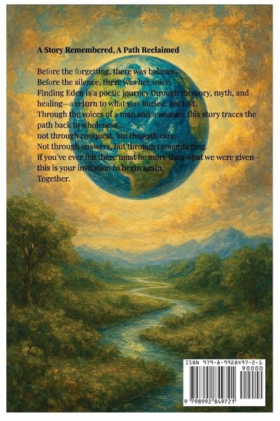 A Poetic Journey Back to What Was Never Truly Lost Before the first war, there was a garden. Before conquest, there was care. Before fear, we walked in balance. Finding Eden is a lyrical and soul-stirring journey-told through poetic chapters, sacred dialogue, and quiet revelations. At its center is a man and a woman, tracing their way back through memory, inherited beliefs, and the wounds of our world-not to escape it, but to remember what we forgot. Part myth, part spiritual reflection, part personal reckoning, this book weaves ancient echoes with modern experience: a near-death encounter in the Dominican Republic, the quiet unraveling of a Marine's inherited faith, and the return of a long-silenced feminine voice. If you've ever questioned the stories you were handed... If you've sensed that faith without balance can become harm... If you're longing not for religion, but for the sacred rhythm of life- This is your invitation. To listen. To unlearn. To remember. And to walk the Earth again-not as exile, but as Eden.