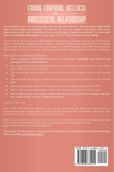 Do you feel like you are in a relationship with someone who wants to be the center of attention all the time? Or that makes you constantly feel inferior? Do you ever wonder if you will be able to love again a person after you've experienced for too long the pain caused by a narcissist? Are you in this kind of relationship and looking for a way to get out of it? Then you need to keep reading... The Journal of Clinical Psychiatry affirmed that in modern times narcissism is on the rise. Narcissists are persons who feel the constant need for admiration, obsessed with themselves and with a lack of empathy towards others. It's hard to say if we are really living in a world full of people who suffer from this personality disorder, but what we can say is that being in a relationship with a narcissist can be truly complicated. Here's a preview of what you will discover:How to recognize INSTANTLY if you are in a narcissistic relationship (and which are the personality traits to watch out for). How to understand with a little-known formula if a relationship can still be saved or if you should quit it NOW for your own well-being. The warning signs to understand if a fascinating personality is a red flag or not from the very first date. Why narcissists are attracted to some people in particular and what you should do if you're one of them. How to stop being the victim of the situation even if you've acted in this way all your life. How to find an honest and kind partner who will show you that it is possible to love again. How to HEAL from a narcissistic relationship with tested and effective techniques and then how to RECOVER your self-confidence and worth. And much, much more... Even if you have always felt powerless and with low self-esteem, this guide will teach you how to recognize narcissists on sight, protect yourself from dangerous and toxic personalities, and recover your self-worth so that you can inspire for what you really deserve. With the expert research in this book, you'll learn how to break free from a narcissistic partner, get ready for a new positive and healthy relationship, and find a loving and romantic partner who respects you and shows you love as it should be. If you want to unlock access to this potent information about relationships and emotional healing, then you should start this book today!
