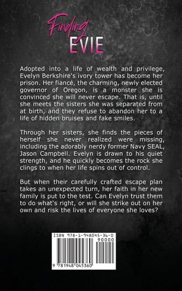 Adopted into a life of wealth and privilege, Evelyn Berkshire's ivory tower has become her prison. Her fiancé, the charming, newly elected governor of Oregon, is a monster she is convinced she will never escape. That is, until she meets the sisters she was separated from at birth, and they refuse to abandon her to a life of hidden bruises and fake smiles. Through her sisters, she finds the pieces of herself she never realized were missing, including the adorably nerdy former Navy SEAL, Jason Campbell. Evelyn is drawn to his quiet strength, and he quickly becomes the rock she clings to when her life spins out of control. But when their carefully crafted escape plan takes an unexpected turn, her faith in her new family is put to the test. Can Evelyn trust them to do what's right, or will she strike out on her own and risk the lives of everyone she loves?