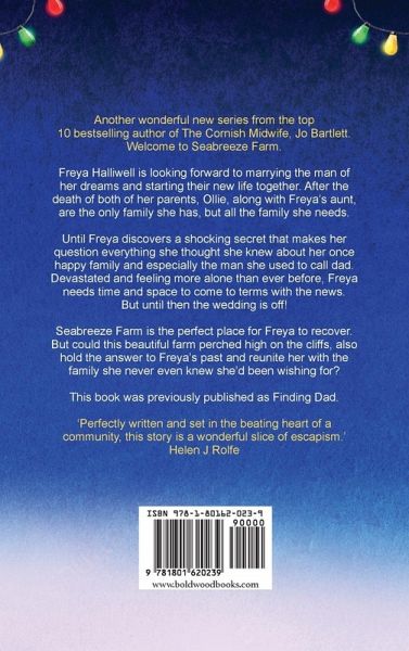 Pre-order the next instalment in Jo Bartlett's wonderful Seabreeze Farm series! Another wonderful new series from the top 10 bestselling author of The Cornish Midwife, Jo Bartlett. Welcome to Seabreeze Farm. Freya Halliwell is looking forward to marrying the man of her dreams and starting their new life together. After the death of both of her parents, Ollie, along with Freya's aunt, are the only family she has, but all the family she needs. Until Freya discovers a shocking secret that makes her question everything she thought she knew about her once happy family and especially the man she used to call dad. Devastated and feeling more alone than ever before, Freya needs time and space to come to terms with the news. But until then the wedding is off! Seabreeze Farm is the perfect place for Freya to recover. But could this beautiful farm perched high on the cliffs, also hold the answer to Freya's past and reunite her with the family she never even knew she'd been wishing for? This book was previously published as Finding Dad. Praise for Jo Bartlett: 'I love second chance stories. I love returning home stories. So a book combining both is an absolute winner for me. The Cornish Midwife is simply gorgeous. Stunning setting, wonderful characters, and oozing with warmth. A triumph from Jo Bartlett.' Jessica Redland 'Perfectly written and set in the beating heart of a community, this story is a wonderful slice of Cornish escapism.' Helen J Rolfe.