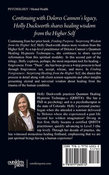 Trauma is an integral part of the human condition. Everyone will experience hurt and pain. Souls incarnate in this very dense and challenging plane, three-dimension Earth, for growth. Intense soul growth can be the purpose of trauma. But how do we grow? How do we heal from trauma? Through forgiveness. In Finding Forgiveness: Surprising Healing from the Higher Self, Holly Duckworth shares wisdom from the Higher Self on a process for forgiveness. She has gleaned this wisdom from her practice facilitating Quantum Healing Hypnosis Technique (QHHT®) for more than a decade. QHHT® is Dolores Cannon's modality of hypnosis. Working with hundreds of clients in the deepest level of trance, in conversation with the Higher Self, she has learned this sacred forgiveness process. It is an alchemy turning human trauma into soul growth. Continuing from her prior book, Finding Purpose: Surprising Wisdom from the Higher Self, Holly shares more wisdom from the Higher Self. In this second part of the trilogy, Holly explores, perhaps, the most important tool for healing - forgiveness. From "Them", she has been given a 4-step process to heal through forgiveness: see, accept, release, and move. In Finding Forgiveness: Surprising Healing from the Higher Self, she shares this process in detail along with client session segments and other insights presenting eternal and universal wisdom about healing from the trauma of the human condition.