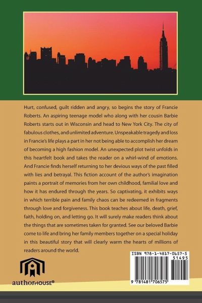 Hurt, confused, guilt ridden and angry, so begins the story of Francie Roberts. An aspiring teenage model who along with her cousin Barbie Roberts starts out in Wisconsin and head to New York City. The city of fabulous clothes, and unlimited adventure. Unspeakable tragedy and loss in Francie's life plays a part in her not being able to accomplish her dream of becoming a high fashion model. An unexpected plot twist unfolds in this heartfelt book and takes the reader on a whirl-wind of emotions. And Francie finds herself returning to her devious ways of the past filled with lies and betrayal. This fiction account of the author's imagination paints a portrait of memories from her own childhood, familial love and how it has endured through the years. So captivating, it exhibits ways in which terrible pain and family chaos can be redeemed in fragments through love and forgiveness. This book teaches about life, death, grief, faith, holding on, and letting go. It will surely make reader think about the things that are sometimes taken for granted. See our beloved Barbie come to life and bring her family members together on a special holiday in this beautiful story that will clearly warm the hearts of millions of readers around the world.