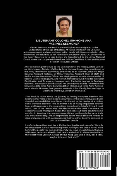 This book is much about the journey to finding complete freedom into blissful living. Years of combined deployments in the household, paired with stressful responsibilities in uniform, contributed to the demise of a professional woman's desire for love. To be free is to be happy. Happiness involves love, and happiness is the most critical ingredient to blissful living! I must admit, part of the reason why I decided to write this book is to share my experiences and mishaps in hopes that someone out there can find some comfort in knowing they are not alone. Others go through the same trials and tribulations daily. We, as responsible adults, make decisions riddled with risks and peppered with consequences that we either become defeated or turn into resilient people. I prefer to be resilient and live a life that is enjoyable and peaceful. We only die once! Death is not a reoccurring event. Once you die, that is it! You leave behind the people you love, and hopefully, you leave enough legacy that you will forever be immortalized in their hearts and minds. So why not enjoy life to the fullest while you can? Let go of your hang-ups. Live a little, risk a little, laugh a little, and fuck a lot!