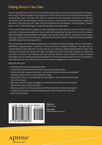 Discover key information buried in the noise of data by learning a variety of anomaly detection techniques and using the Python programming language to build a robust service for anomaly detection against a variety of data types. The book starts with an overview of what anomalies and outliers are and uses the Gestalt school of psychology to explain just why it is that humans are naturally great at detecting anomalies. From there, you will move into technical definitions of anomalies, moving beyond "I know it when I see it" to defining things in a way that computers can understand.