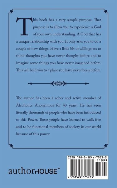 This book has a very simple purpose. That purpose is to allow you to experience a God of your own understanding. A God that has a unique relationship with you. It only asks you to do a couple of new things. Have a little bit of willingness to think thoughts you have never thought before and to imagine some things you have never imagined before. This will lead you to a place you have never been before.