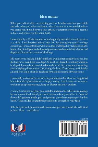 Ideas matter. What you believe affects everything you do. It influences how you think and talk, what you value and want, who you view as a role model, where you spend your time, how you treat others. It determines who you become in life....and where you live after death. I was raised by a Christian mother and regularly attended worship services as a child. I was baptized when I was 10. But during my secular college experience, I was confronted with ideas that challenged my religious beliefs. Some of my intelligent and educated professors said materialistic chance had displaced God as the creator of all things. My mom loved me and I didn't think she would intentionally lie to me, but she had never even been to college! As much as I loved her, nobody wants to be duped. I wanted and needed to know the truth. So I spent some agonizing years weighing the evidence concerning God and Christianity, until finally a number of simple but far-reaching revelations became obvious to me. I eventually arrived at the unwavering conclusion that those accomplished but misguided professors were simply wrong. And I came to recognize evolution as a pseudoscience, long on bluster but short on facts. Finding God begins by giving you a solid foundation for belief in an amazing, loving, eternal God. (And you don't have to take my word for it. Some of the world's greatest minds, past and present, provide strong support for that belief.) Then it adds several firm principles to strengthen your faith. Whether you look far out into the cosmos or peer deep inside the cell, God is there. Read...and believe!
