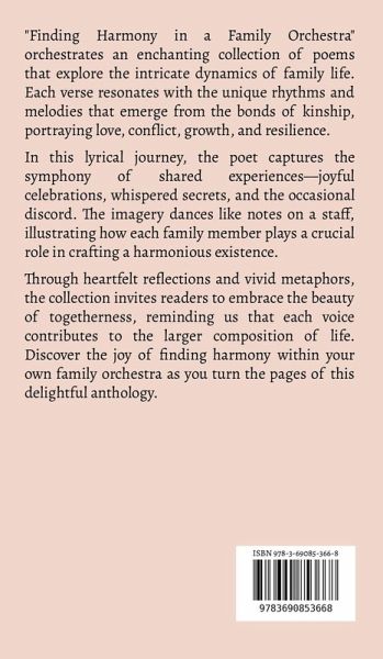 "Finding Harmony in a Family Orchestra" orchestrates an enchanting collection of poems that explore the intricate dynamics of family life. Each verse resonates with the unique rhythms and melodies that emerge from the bonds of kinship, portraying love, conflict, growth, and resilience. In this lyrical journey, the poet captures the symphony of shared experiences-joyful celebrations, whispered secrets, and the occasional discord. The imagery dances like notes on a staff, illustrating how each family member plays a crucial role in crafting a harmonious existence. Through heartfelt reflections and vivid metaphors, the collection invites readers to embrace the beauty of togetherness, reminding us that each voice contributes to the larger composition of life. Discover the joy of finding harmony within your own family orchestra as you turn the pages of this delightful anthology.