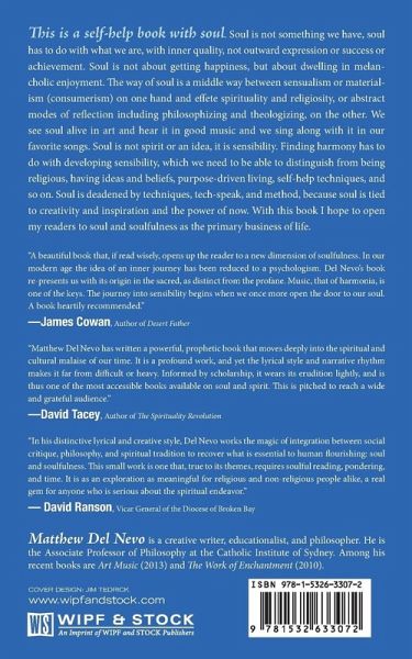 This is a self-help book with soul. Soul is not something we have, soul has to do with what we are, with inner quality, not outward expression or success or achievement. Soul is not about getting happiness, but about dwelling in melancholic enjoyment. The way of soul is a middle way between sensualism or materialism (consumerism) on one hand and effete spirituality and religiosity, or abstract modes of reflection including philosophizing and theologizing, on the other. We see soul alive in art and hear it in good music and we sing along with it in our favorite songs. Soul is not spirit or an idea, it is sensibility. Finding harmony has to do with developing sensibility, which we need to be able to distinguish from being religious, having ideas and beliefs, purpose-driven living, self-help techniques, and so on. Soul is deadened by techniques, tech-speak, and method, because soul is tied to creativity and inspiration and the power of now. With this book I hope to open my readers to soul and soulfulness as the primary business of life.