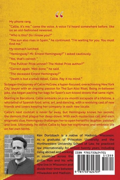 My phone rang. "Callie, it’s me," came the voice. A voice I’d heard somewhere before, like on an old-fashioned newsreel. "Who is this? Do I know you?" "The sun also rises in Spain," he continued. "I’m waiting for you. You must find me." My stomach lurched. "Hemingway? Mr. Ernest Hemingway?" I asked cautiously. "Yes, that’s correct." "The Pulitzer Prize winner? The Nobel Prize author?" "Correct again. Well done," he said. "The deceased Ernest Hemingway?" "Death is but a small detail, Callie. Pay it no mind." So began the journey of Callie McGraw, a hyper-focused, overachieving New York City lawyer with an ongoing passion for The Sun Also Rises. Being in-between jobs, she began packing her bags for Spain’s sun-kissed streets that same night. Starting in Barcelona, Callie embarks on a six-month escapade of a lifetime, a whirlwind of Spanish food, wine, art, and dancing, with a revolving cast of new friends and lovers keeping her company in each new locale. Callie’s next cocktail is never far away, but Hemingway knows her secrets, the demons that plague her deep-down. With each mysterious call and each enigmatic clue, Hemingway challenges her to open herself to laughter, passion, and love. Ultimately, he defies Callie to face her nightmares and embrace life on her own terms.