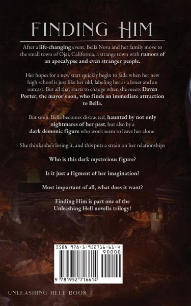 After a life-changing event, Bella Nova and her family move to the small town of Ojai, California, a strange town with rumors of an apocalypse and even stranger people. Her hopes for a new start quickly begin to fade when her new high school is just like her old, labeling her as a loner and an outcast. But all that starts to change when she meets Daven Porter, the mayor's son, who finds an immediate attraction to Bella. But soon, Bella becomes distracted, haunted by not only nightmares of her past, but also by a dark demonic figure who won't seem to leave her alone. She thinks she's losing it, and this puts a strain on her relationships. Who is this dark mysterious figure? Is it just a figment of her imagination? Most important of all, what does it want? *Finding Him is part one of the Unleashing Hell novella trilogy!