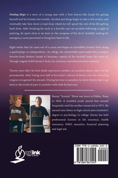 Finding Hope is a story of a young man with a Tom Sawyer-like knack for getting himself and his friends into trouble. Alcohol and drugs begin to take a toll on him, and eventually take him down a road from which he will spend the rest of his life getting back from. After breaking his neck in a horrific one-car accident following a night of partying, he spent close to an hour in the company of the devil, fearfully waiting for emergency room personnel to bring him back to life. Eight weeks later he came out of a coma and began an incredible journey from being a quadriplegic to independence. At college, his indomitable spirit made him a campus favorite-from Student Senate to honorary captain of the football team, life went on. Though tragedy befell Jimmy's body, his resilience and determination endured. ¿Twenty years after his first death experience another car accident almost takes his life permanently. After losing over half of his body's volume of blood, even the attending surgeon recognized the miracle. During his time in paradise, he knew that he had to go back to the world of pain to minister with what he had seen.
