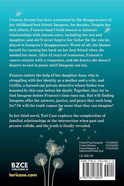 Frances Jerome has been tormented by the disappearance of her childhood best friend, Imogene, for decades. Despite her best efforts, Frances hasn't built honest or intimate relationships with anyone since, including her son and daughter, and she'll never forgive her father for the role he played in Imogene's disappearance. Worst of all, she blames herself for turning her back on her best friend when she needed her most. After 43 years of remission, Frances's cancer returns with a vengeance, and she knows she doesn't deserve to rest in peace until Imogene can too. Frances enlists the help of her daughter Jean, who is struggling with her identity as a mother and a wife, and Griffin, a burned-out private detective whose father was haunted by this case before his death. Together, they try to find Imogene before Frances's time runs out. But will finding Imogene offer the answers, justice, and peace they each long for? Or will the truth expose far more than they can imagine? In her third novel, Teri Case explores the complexities of familial relationships at the intersection when past and present collide, and the truth is finally revealed.