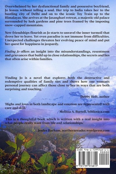 Jo flees the country without telling a soul in a dramatic quest for freedom and self-knowledge. In the beautiful surroundings of a former palace in the snow-capped Himalayas, she has the time and space to reflect on her life. The peace she finds there helps Jo to unravel her turmoil, but unexpected challenges test her new-found equilibrium to the limit. Finding Jo focuses on relationships between families, lovers and friends, and the resentment and long-held beliefs that threaten to destroy them. Jo's desire for a deeper purpose in life acts as a catalyst to other family members back at home. "The book is so well written that it's easy to escape into the scenes. With the backdrop of India and the Himalayas Finding Jo is a beautifully crafted joy of a book to read." Instagram blogger/reviewer. 'I think this book will inspire alot of women like myself who just want to get away from it all.' Reviewer, Australia
