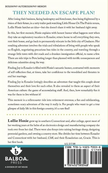 They needed an escape plan! After losing their business, facing bankruptcy and foreclosure, then being frightened by a vision of their future, in a ratty trailer park watching Little House On The Prairie reruns, Lollie Hoxie hatches an idea-but she doesn't share it with her husband right away. In this, her first memoir, Hoxie explains with honest humor what happens next when they take an exploratory vacation to Ecuador, return home to sell everything they own, rent their house, and go back to permanently relocate in the little city of Gualaceo. Her resulting adventure involves the trials and tribulations of living with people who speak no English, negotiating precarious bus rides in the country, and traveling through a strange little town with dirt roads and a drunken immigration official, to name a few. There are side trips to Peru lasting longer than planned with terrific consequences and delicious calamities along the way. Finding Joy in Ecuador is filled with Hoxie's sarcastic humor, contrasted with moments of self-reflection that, at times, take her confidence to the woodshed and threaten to end her marriage. Finding Joy in Ecuador lovingly describes an adventure that taught this couple about themselves and their love for each other. It also revealed to them an aspect of their American culture: the game of accumulating stuff. And, then, how remarkably fun it was for them to live without it! This memoir is a rollercoaster ride into retirement overseas; a fun and exhilarating, sometimes scary adventure of the way it really is. For people who want to get a true glimpse of daily life in this foreign country, it's a rare find!