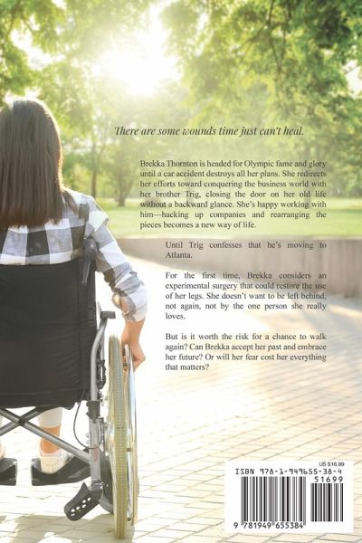 There are some wounds time just can't heal. Brekka Thornton is headed for Olympic fame and glory until a car accident destroys all her plans. She redirects her efforts toward conquering the business world with her brother Trig, closing the door on her old life without a backward glance. She's happy working with him-hacking up companies and rearranging the pieces becomes a new way of life. Until Trig confesses that he's moving to Atlanta. For the first time, Brekka considers an experimental surgery that could restore the use of her legs. She doesn't want to be left behind, not again, not by the one person she really loves. But is it worth the risk for a chance to walk again? Can Brekka accept her past and embrace her future? Or will her fear cost her everything that matters?